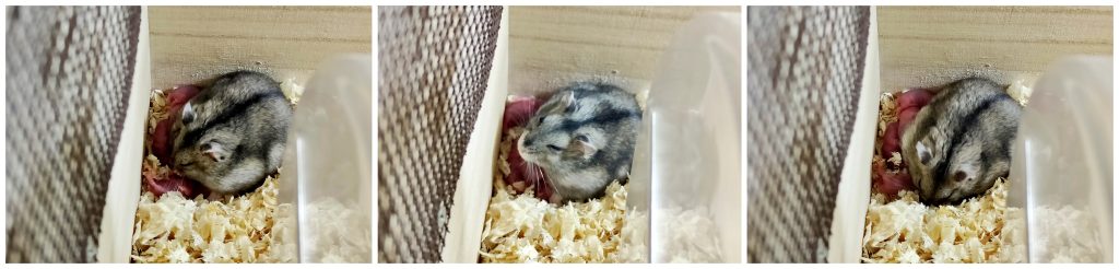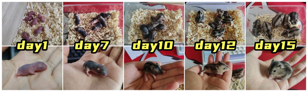 三线仓鼠一般性情较为温和,但孕期的雌鼠会表现出情绪激动、害怕、应激反应强烈等现象。比如我的鼠子,怀宝宝之前还让盘,怀宝宝之后伸手碰它便会迅速逃跑或者反咬。孕期雌鼠临产时会到处挖掘以为宝宝挑选一处合适的诞生区域,在饲养箱中的木屑里钻来钻去,这种现象极其明显,而且此时雄鼠也会跟着一同帮忙挖掘。雌鼠从怀孕到分娩大概只需半个月左右,一胎5-7只鼠宝宝。分娩结束后短时间内鼠妈会把鼠宝宝全部叼回躲避屋中哺育,平常鼠宝宝就躲在鼠妈的身体下,便于庇护和喂奶。鼠宝宝在12天左右后可脱离母鼠独立生活。