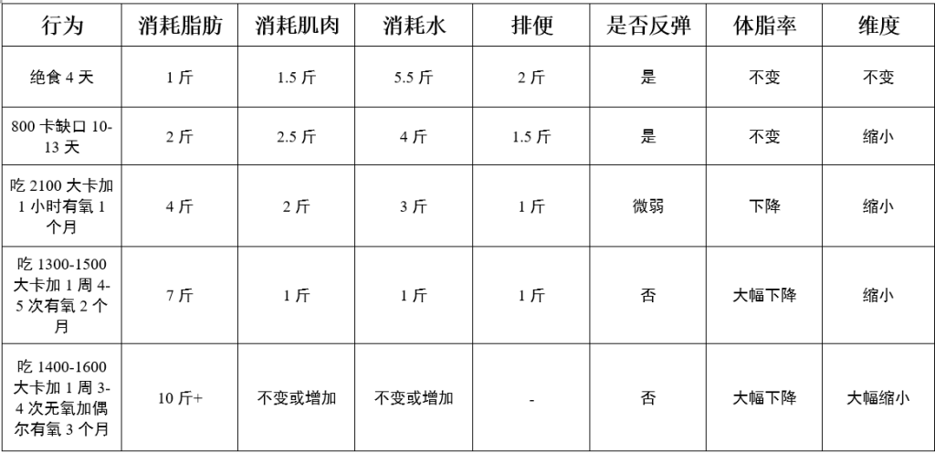 故从正确的、科学的减肥角度来说,我先说下结论:减肥的本质应该是降低体脂率,而不是单纯的减轻体重。这是对于减肥的人来说很通俗易懂但又及其容易被忽略的很重要的知识。减肥的本质是什么?制造热量缺口!但是要在保证肌肉不流失的前提下创造热量缺口。肌肉代表着蛋白,蛋白对于我们来说是“好东西,而减肥我们要消耗掉的脂肪,脂肪是“坏东西”。我们要让坏东西不断减少的同时保证好东西最起码不变,甚至增多。单纯的饥饿的确会消耗脂肪,但蛋白也会随之被消耗,肌肉便会流失。所以减肥是有逻辑、讲方法的一件事情。制造热量缺口也会有很多说法。